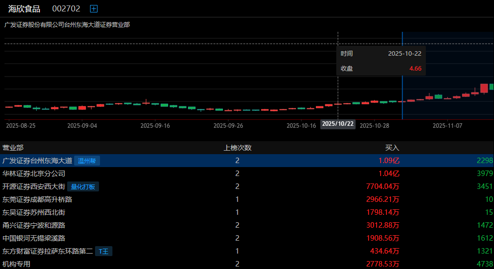 落实到执行层面,还是资金买账,量化打板、T王都来拉抬。正所谓众人拾柴火焰高,合力作用最终把 海欣食品 推了上去。
