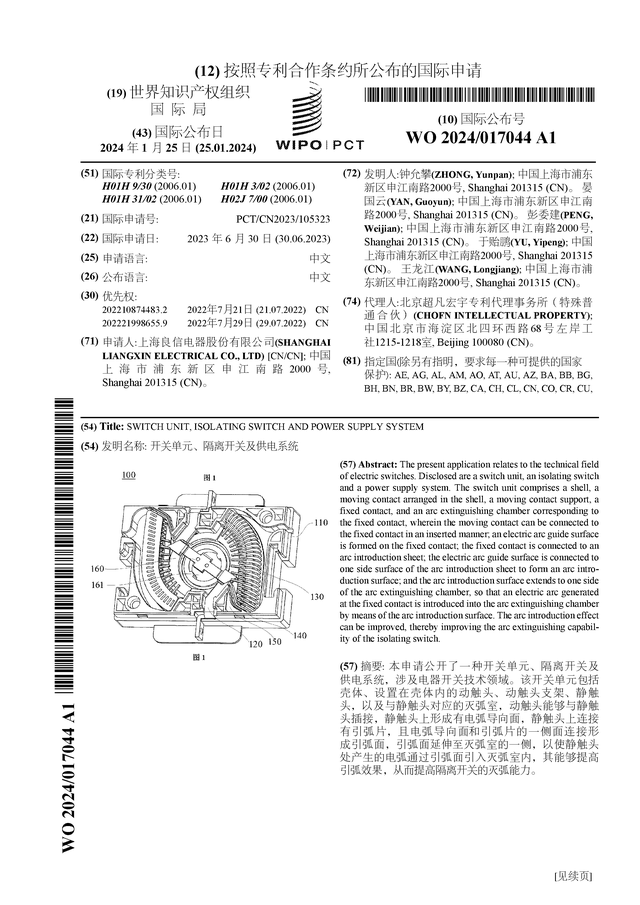 数据显示良信股份(002706)公布了一项国际专利申请,专利名为“开关单元、隔离开关及供电系统”,专利申请号为PCT/CN2023/105323,国际公布日为2024年1月25日。
