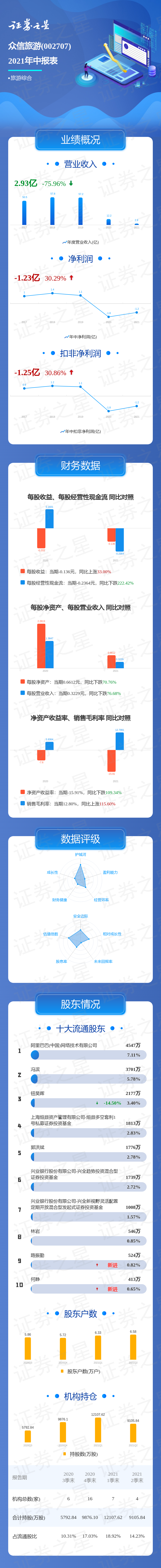 众信旅游2021中报显示,公司主营收入3.12亿元,同比下降74.86%;归母净利润-12291.93万元,同比上升30.29%;扣非净利润-12468.51万元,同比上升30.86%;负债率80.08%,投资收益-504.14万元,财务费用3429.05万元,毛利率12.8%。