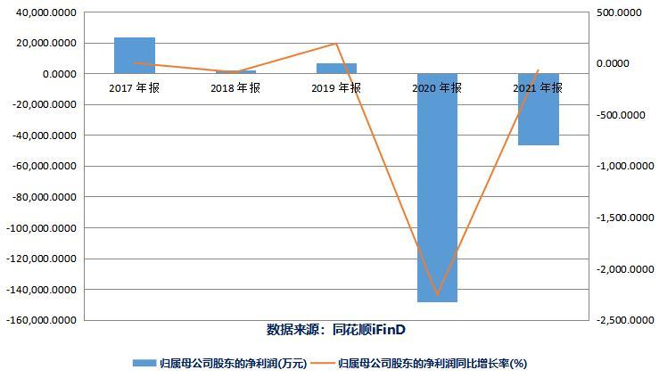 从财报数据来看,2020年该公司营业收入开始出现大幅下滑。2019年至2021年,公司营业收入分别为126.22亿元、15.61亿元、6.84亿元,其中2020 年、2021年分别同比下滑87.63%、56.19%。