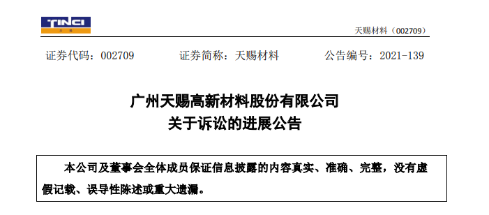 10月21日,天赐材料发布公告,广州天赐、九江天赐与华慢、刘宏、安徽纽曼精细化工有限公司、吴丹金、彭琼、胡泗春、朱志良侵害技术秘密一案,最高人民法院民事裁定书裁定驳回再审申请人华慢、刘宏、安徽纽曼的再审申请。至此,天赐材料通过刑事、民事多方位维权,终获全胜。