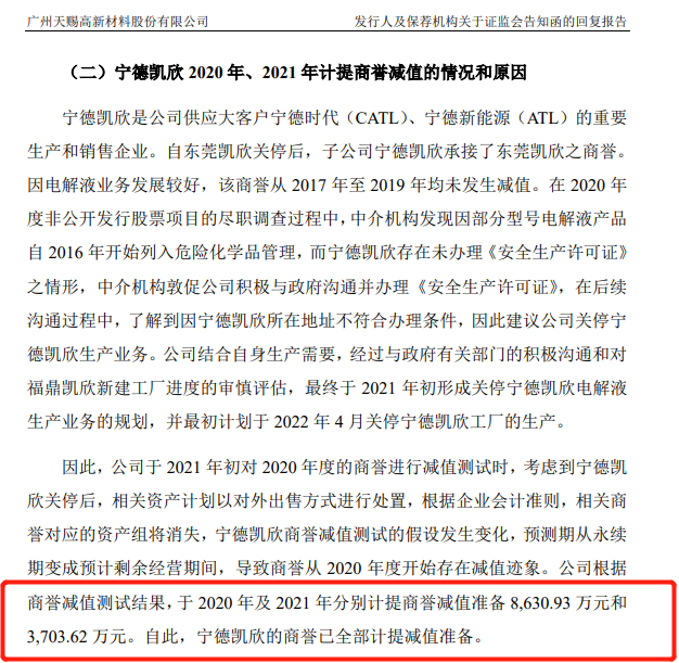《回复报告》显示,在2020年度非公开发行股票项目的尽职调查过程中,中介机构发现因部分型号电解液产品自2016年开始列入危险化学品管理,而天赐材料子公司宁德凯欣存在未办理《安全生产许可证》之情形。最终,天赐材料于2021年初形成关停宁德凯欣电解液生产业务的规划,并分别于2020年及2021年计提商誉减值准备8630.93万元和3703.62万元。
