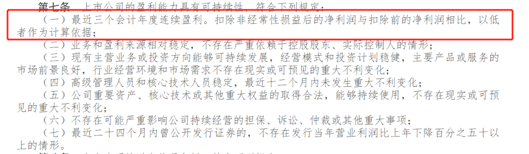 根据证监会发布的《上市公司证券发行管理方法》第七条第一项规定,上市公司公开发行证券须符合:“最近三个会计年度连续盈利。扣除非经常性损益后的净利润与扣除前的净利润相比,以低者作为计算依据”。