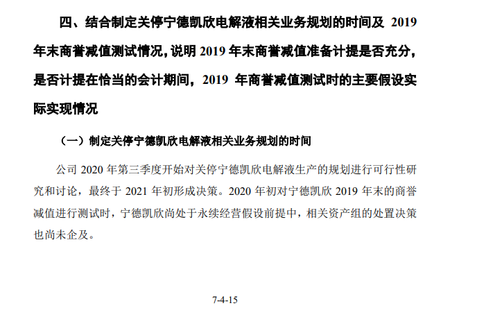 天赐材料解释称,其于“2020年第三季度开始对关停宁德凯欣电解液生产的规划进行可行性研究和讨论。”即在2019年及以前,宁德凯欣尚处于永续经营假设前提中,经过商誉减值测试,公司认为2019年末宁德凯欣无需计提商誉减值准备。
