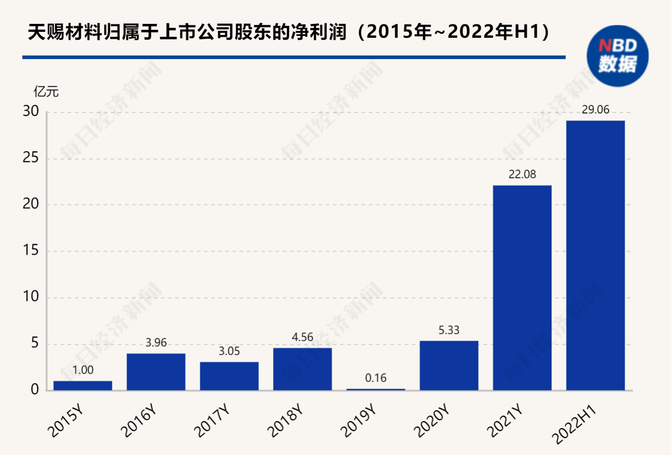 8月24日晚,天赐材料披露了2022年半年报。上半年公司实现营收103.63亿元,同比增长180.13%,实现净利润29.06亿元,同比增长271.32%。公司今年上半年净利润已超去年全年盈利。