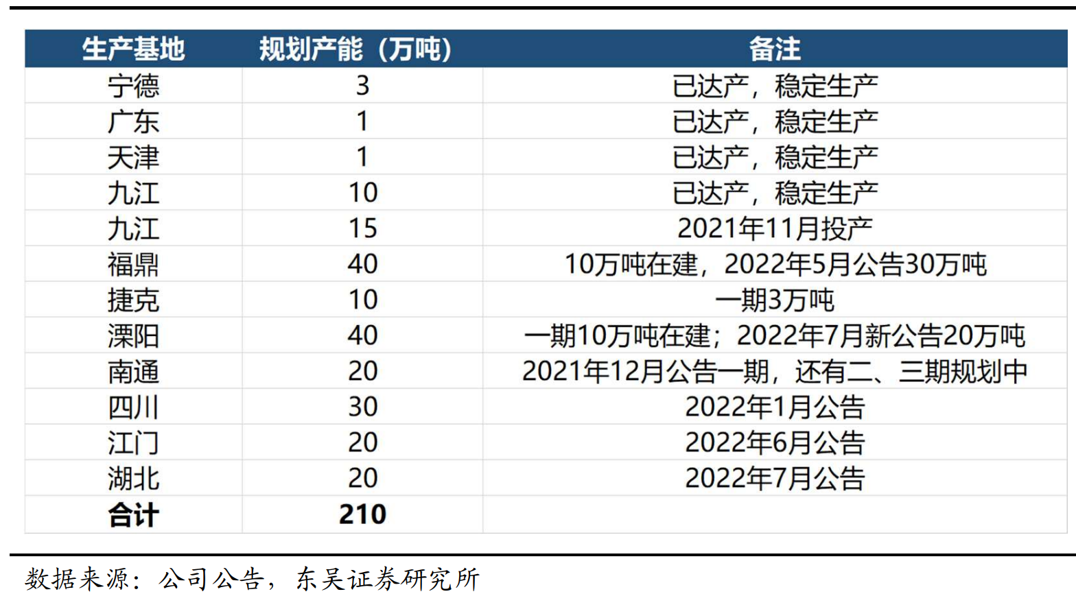 到今年下半年,天赐材料电解液出货量有望进一步增长。据东吴证券预计,天赐材料2022年电解液出货量将达到33万吨,同比增长129%。产能增长是由于此前天赐材料积极扩产。据不完全统计,目前,公司在福鼎、南通、眉山、江门等地均有规划电解液项目。今年6月下旬,天赐材料发布《电解液全球运营白皮书》提到,公司全球规划总产能已超过200万吨。
