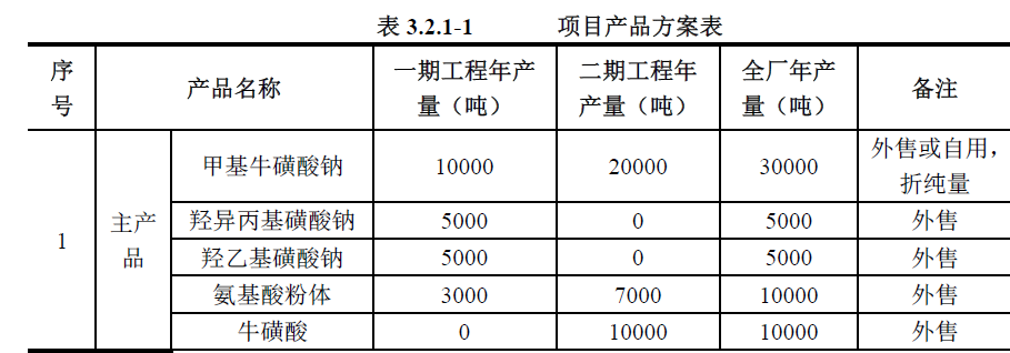二期工程:甲基牛磺酸钠20000吨,氨基酸粉体7000吨,牛磺酸10000吨,小计37000吨;副产物硫酸钠6049.2吨。