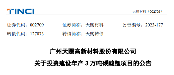 天赐材料12月6日公告,子公司九江天赐资源循环科技有限公司拟使用自筹资金投资建设“年产3万吨碳酸锂项目”,项目建成投产后,预计可实现年平均营业收入25.28亿元,年平均净利润1.68亿元。