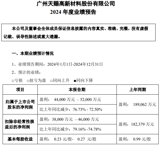 1月8日,天赐材料公告,预计公司2024年度归属于上市公司股东的净利润为4.4亿元至5.2亿元,比上年同期下降72.50%至76.73%。不出意外,天赐材料将连续两年净利大幅下跌,2023年度公司实现归母净利润18.91亿元,同比下降66.92%。
