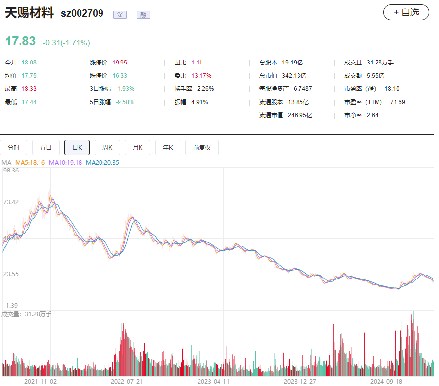 二级市场上,天赐材料也经历了大涨大落,公司股价在2020年和2021年取得了较大幅度上涨,2021年10月底创出84.11元/股的最高点,此后便震荡下跌,尤其是2022年7月以来股价跌跌不休,2024年9月下旬一度达到12.86元/股的低点,距离最高点跌幅超84%。截至今年1月8日收盘,天赐材料股价17.83元/股,总市值342.13亿元。