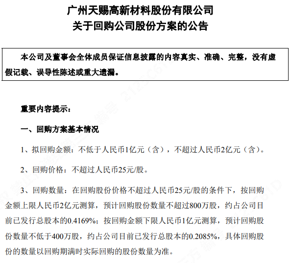 天赐材料1月6日再次公告,公司拟使用自有资金和自筹资金(含商业银行回购专项贷款等),以集中竞价方式回购公司部分A股股份,本次回购股份将用于维护公司价值及股东权益所必需,并将按照有关回购规则和监管指引要求在规定期限内出售。本次拟回购金额不低于1亿元,不超过2亿元,回购价格不超过25元/股。公司已取得中信银行股份有限公司广州分行出具的《股票回购专项贷款合作函》,同意为公司提供不超过1.8亿元的股票回购贷款支持,贷款期限不超过3年。