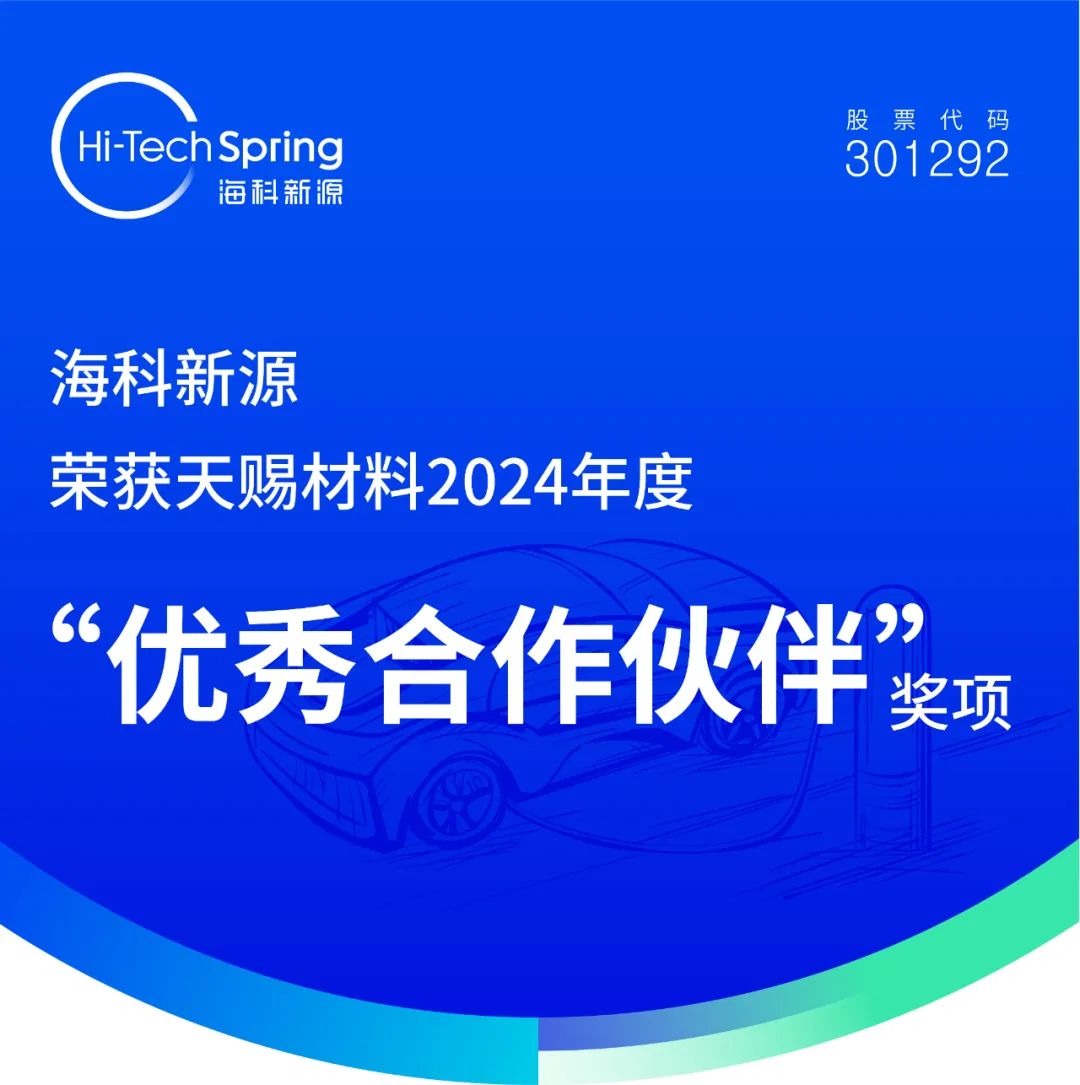 近日,海科新源公司(股票代码:301292)凭借卓越的产品质量、技术创新能力和高效服务,荣获客户广州天赐高新材料股份有限公司(以下简称“天赐材料”,股票代码:002709)颁发的“2024年度优秀合作伙伴”奖项。