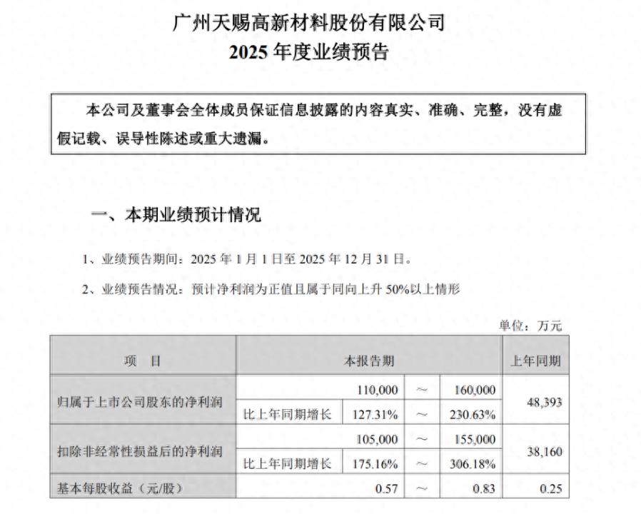 近日,锂电材料龙头天赐材料(002709)发布业绩预告,公司预计2025年净利润为11亿元至16亿元,较上年同期增长127.31%至230.63%,扣非后净利润同比增长175%——306.18%。