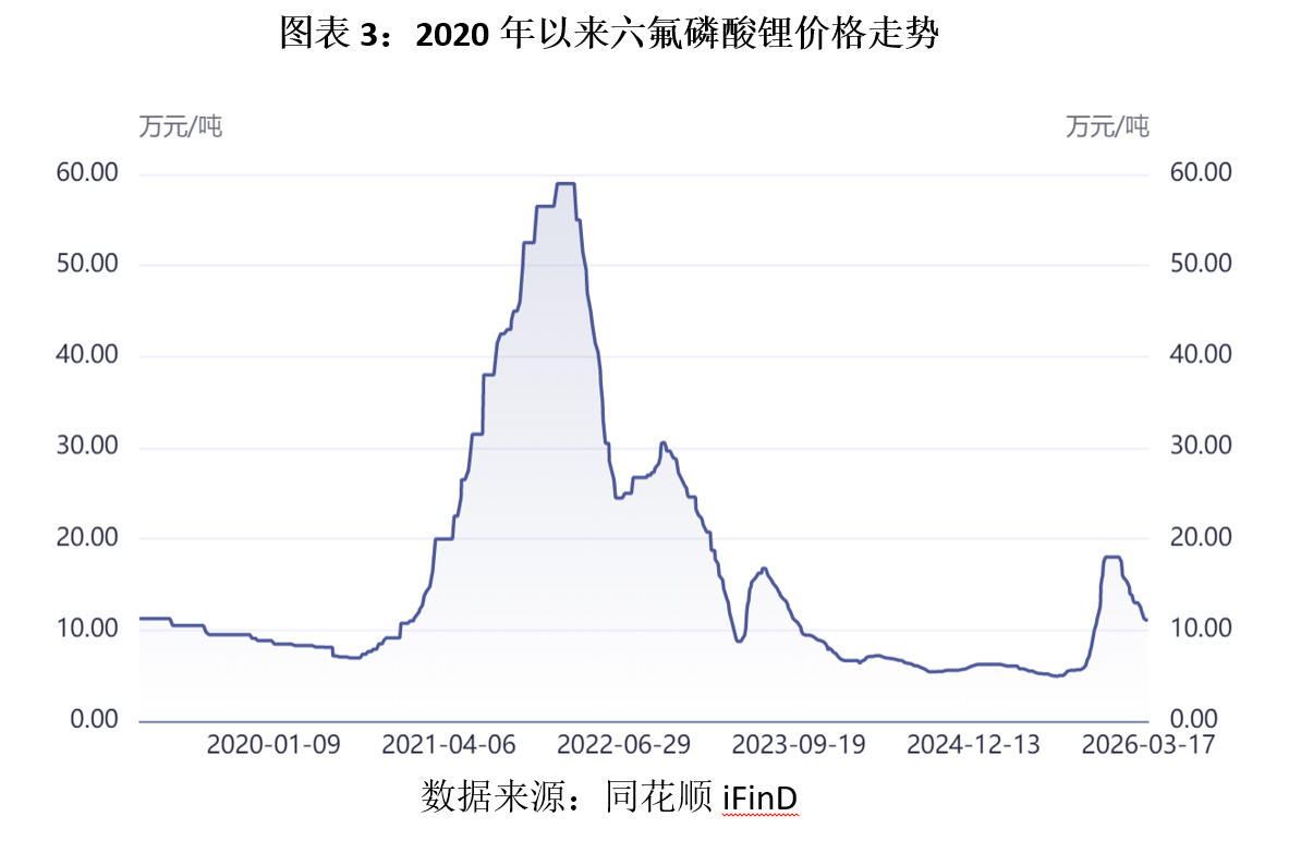 这种周期性波动在2026年年初已有所显现。经历了2025年下半年的暴涨后,六氟磷酸锂价格开始出现回落,截止2026年3月17日,六氟磷酸锂价格已降至11.10万元/吨,较2025年11月末的高点18万元/吨回落近40%。