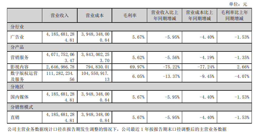而曾经思美传媒占比最大的营销服务业务却在近些年逐年缩减,2022年年报数据中,营销服务的毛利率仅为5.62%,2020年营销服务的毛利率还为10.95%。相对的,新兴的影视内容的毛利率却由2020年的15.01%增长到了69.97%。