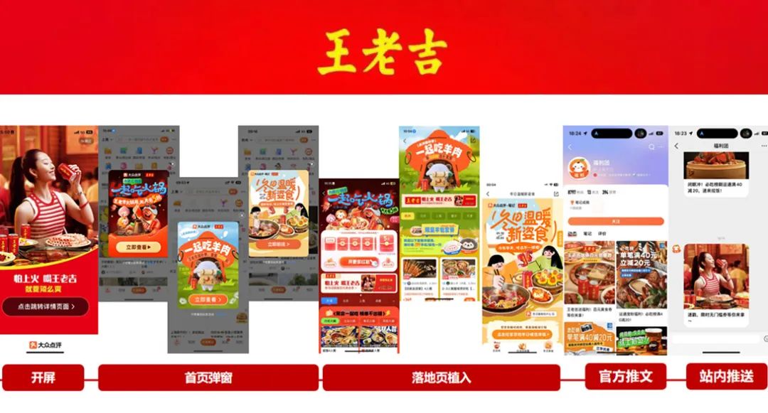 大众点评项目作为王老吉2024年品牌重点战略佐餐项目,让王老吉与做餐文化和辣文化深度绑定,全链路布局打通双域流量,实现线上赋能线下联动区域KA商户,通过大曝光资源加持强势导流活动套餐,通过原生内容信息流吸引用户。项目整体曝光超29亿,邀约合作商户店铺数超过600家,话题讨论度超2000万,持续强化“怕上火和王老吉就要辣么爽”品牌心智,将吃辣就喝王老吉的场景深入人。