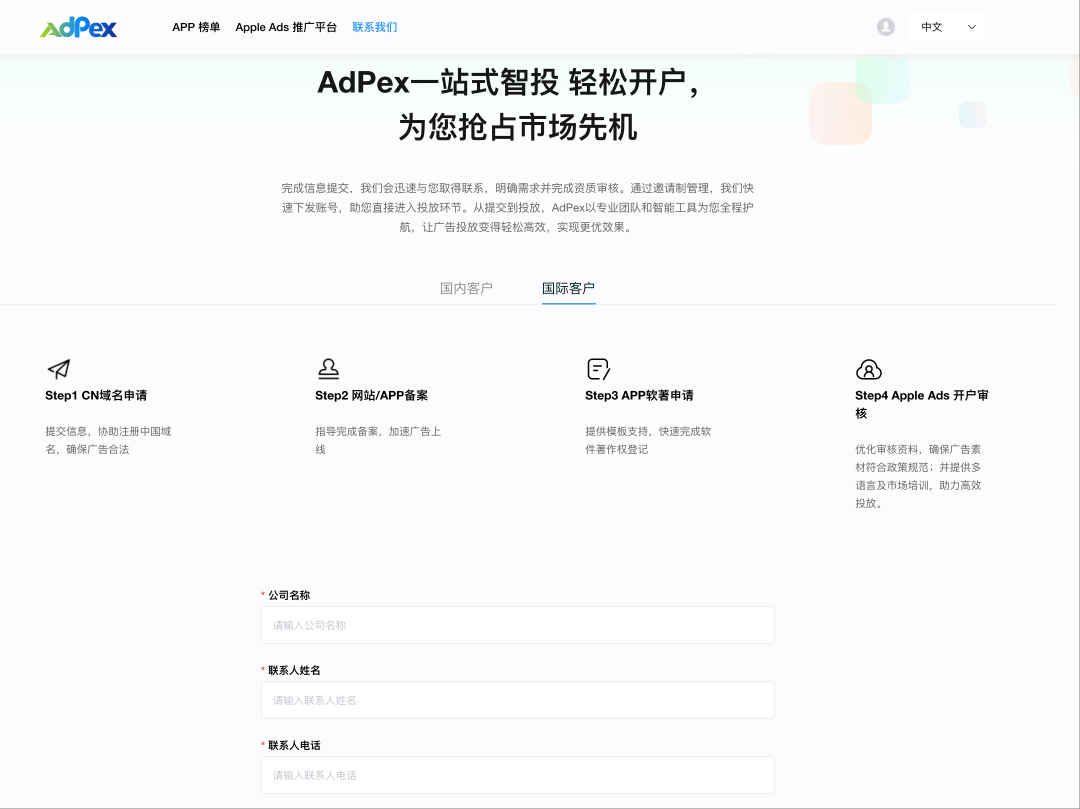 AdPex 专为广告主打造的专属资质预审通道,通过精简流程和智能支持,助力客户快速进入后续投放流程。