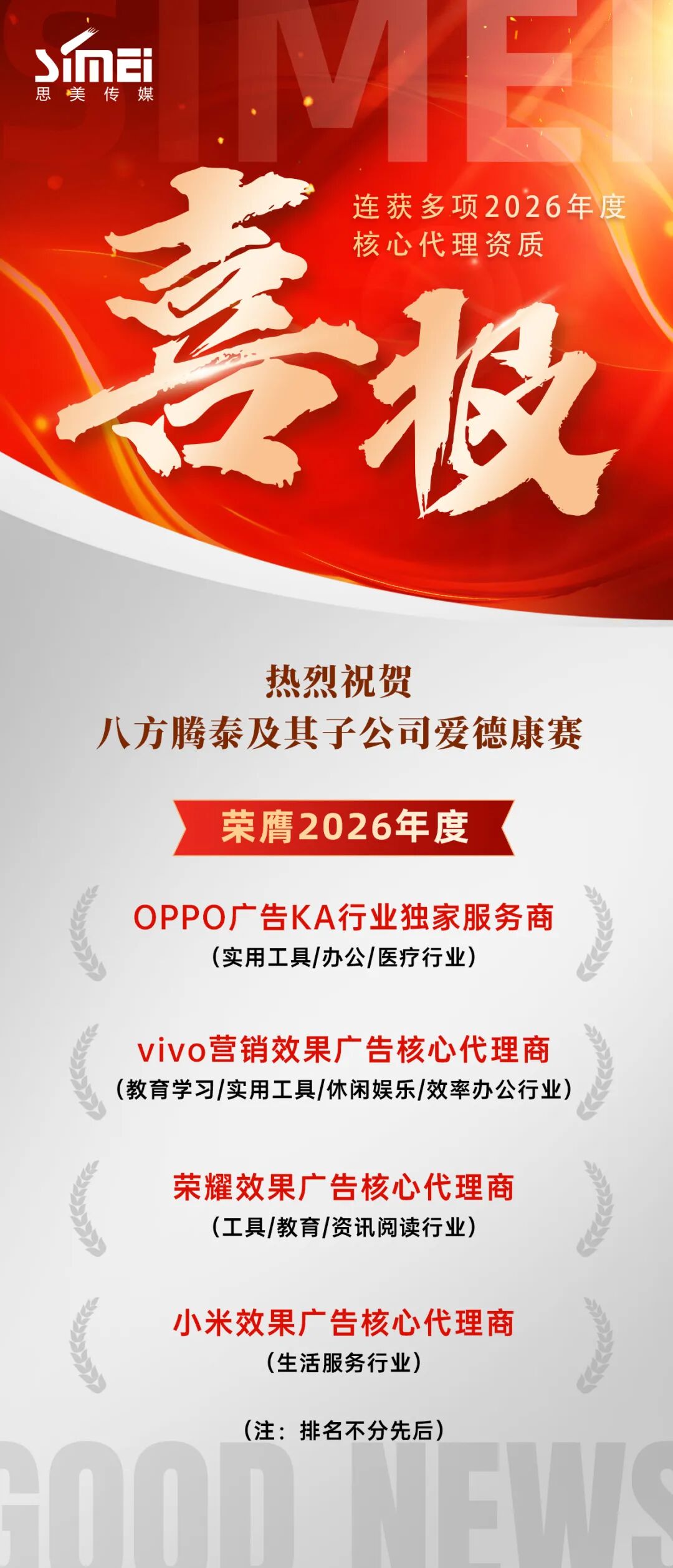 近日,思美传媒旗下八方腾泰及其子公司爱德康赛,成功赢得多家主流数字媒体平台2026年度核心代理资质,凭借出色的专业服务能力、精准的投放策略与深厚的行业洞察,在激烈竞争中再次脱颖而出。
