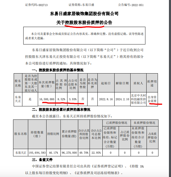 公告披露,东易天正因自身资金需要,质押数量1650万股,占其所持股份的8.52%,占公司总股本的3.93%。