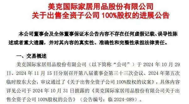 11月27日,美克家居宣布出售全资子公司北京美克家居用品有限公司100%股权,交易价格为4亿元。美克家居表示,此举是根据经营发展策略做出的调整,不会对公司的经营产生重大影响。然而,数据显示,美克家居净利润已连续两年下滑,2024年前三季度净利润同比下降65.25%,业绩压力凸显。