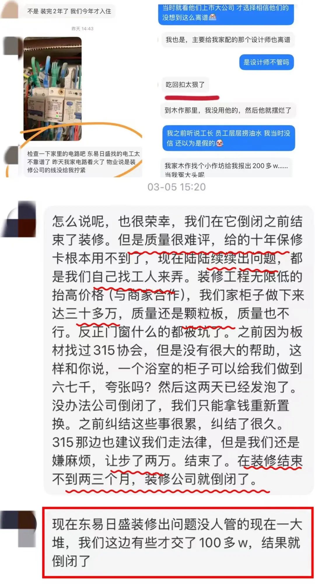 业主群体同样水深火热。网易财经了解到的6位业主中,最高被拖欠装修款达120万元。云南一位业主称,东易木作报价30万元的柜子使用颗粒板且存在严重质量问题;杭州业主则指控东易日盛设计师通过推荐高价小作坊吃回扣,“200万报价比市场价高出50%”。北京某业主指出,“装完2年今年入住的房子电路着火,物业说是装修公司的线没拧紧,东易的电工太不靠谱。”供应商层面,716家合作厂商被拖欠货款8560万元,北京鹏元兴达商贸公司因516.87万元债权未清偿,直接推动法院启动预重整程序。