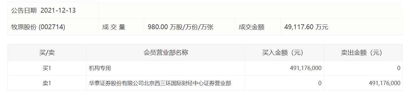 牧原股份今日出现4.91亿元折价大宗交易,成交980万股,成交均价为50.12元/股