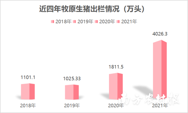 牧原的出栏成绩再次刷新历史。《农财宝典》新牧网记者统计近四年牧原生猪出栏数据发现,2021年牧原生猪出栏量比前三年的总和还高,2018年-2020年牧原生猪出栏量总和仅为3937.93万头,比2021年少88.37万头。农业农村部猪肉全产业链监测预警首席分析师、中国农业科学院朱增勇研究员曾表示,2021年全国生猪出栏量预计将达到6.8亿头,按这个数据计算,仅牧原一家企业便占据了全国6%的生猪出栏量。