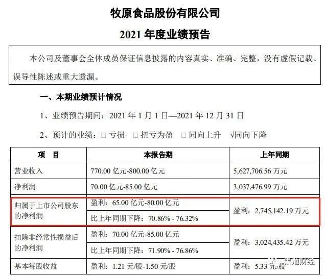 昨日晚间,牧原股份披露2021年业绩预告,预计去年净利润为70亿-85亿,同比降超70%;归属于上市公司股东的净利润预计为65.00亿元-80.00亿元,同比下降70.86%-76.32%。