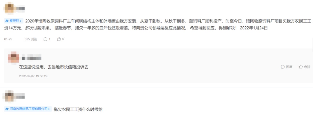 结合参保人数和资质证书,牧原建筑也许是为了最大程度地压缩成本,秉持了“够用就好”的做事风格,但这也伴随着可能引发的底层劳务纠纷,在一些平台上关于牧原建筑的下方评论区里,就有不少对于牧原建筑旗下项目涉及拖欠工资、霸凌建厂的投诉。