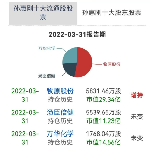 根据牧原股份2022年一季报,“超级牛散”孙惠刚持有5831万股,持股比例约1.1%,位列第四大股东。期间孙惠刚增持819万股,环比四季度增长16.35%,以期内股价区间(47元-62元)计算,大约斥资4-5亿元。