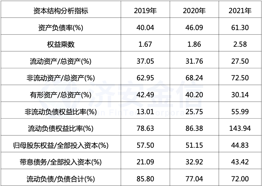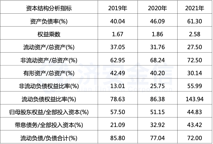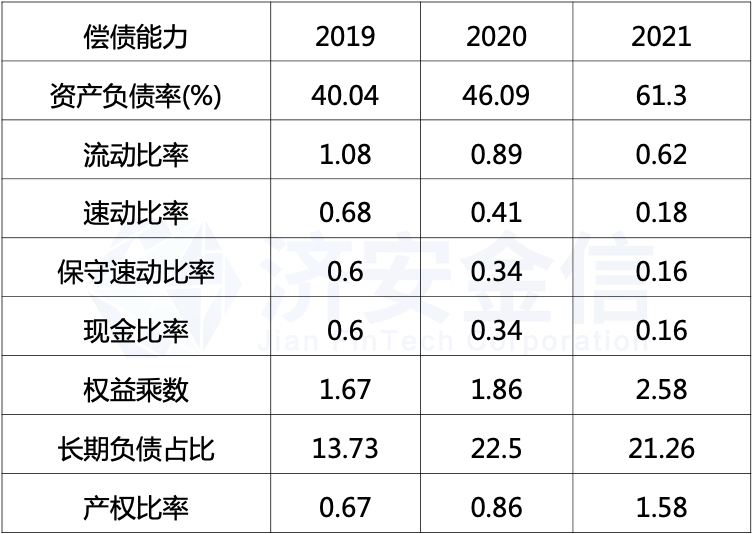 权益乘数由2019年的1.67增加到2021年的2.58,说明企业所有者投入的资本占总资产的比重在下降。