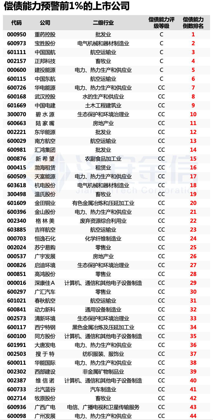 需要特别解释偿债能力评级的标准:偿债能力AAA、AA、A级表示公司偿债能力优秀,利润或现金能够覆盖到期的所有负债,不存在拖延债务的情形,公司信誉好;偿债能力BBB、BB、B级表示公司偿债能力一般,基本能够偿付到期的所有负债,存在较多债务展期;偿债能力CCC、CC、C级表示公司偿债能力较差,偿付到期的所有负债存在较大风险,可能存在较多拖延债务的情形。