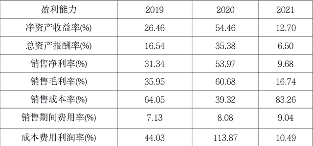 净资产收益率由2020年的54.46下降到2021年的12.7,总资产报酬率下滑约29%,销售净利率和毛利率更是大幅减小,2021年销售净利率仅为9.68,毛利率为16.74,与之对应,企业的销售成本率同比上升约43个百分点,2021年超过了80%,成本费用利润率同比下降103%。