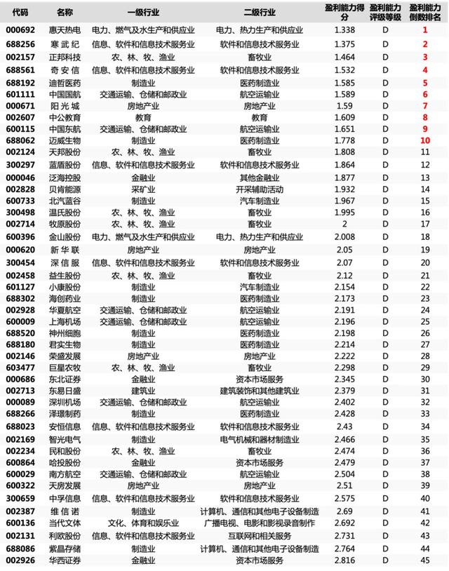 表1:一季度全部上市公司盈利能力倒数榜排名