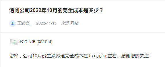 值得注意的是,11月15日,有投资者在投资者互动平台提问:公司10月份以来的对外交流一直有提到“4季度有望实现15元/kg左右的阶段性成本目标”,请问从目前的存活率、饲料价格看,年底完全成本做到15元/kg的可能性大不大,谢谢!
