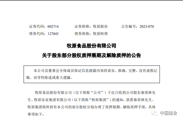 此外,牧原股份近日也是动作频频。6月13日公告,牧原股份控股股东秦英林质押1071.00万股。秦英林本次质押占其所持股份比例为0.51%,占总股本比例为0.20%。按照当前牧原股价42.56元/股,1017万股约4.5亿元。