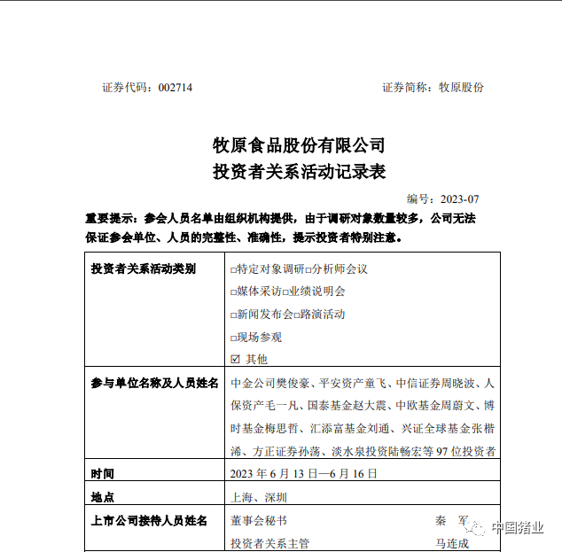 牧原股份发布公告称,2023年6月13日至6月16日期间,牧原股份接受中信证券等机构调研,公司董事会秘书秦军、投资者关系主管马连成参与接待,并回答了调研机构提出的问题。