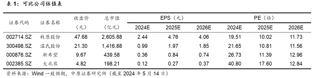维持公司“增持”评级。考虑到猪价波动情况,预计公司2024-2026年归母净利润分别为173.67/192.68/98.05亿元,EPS分别为3.18/3.53/1.79元,对应PE为15.01/13.52/26.58倍。根据生猪养殖行业可比上市公司市盈率情况,给予公司2024年23X PE,目前公司仍有估值扩张空间。考虑到公司龙头企业的规模优势和屠宰板块的业绩增长空间,维持公司“增持”的投资评级。