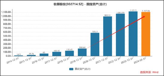 由于公司采取的是自繁自养模式,因此公司的固定资产也随之水涨船高,固定资产规模超千亿规模。公司的固定资产由2018年的135.45亿元上涨至2023年的1121.5亿元,增幅超过7倍。