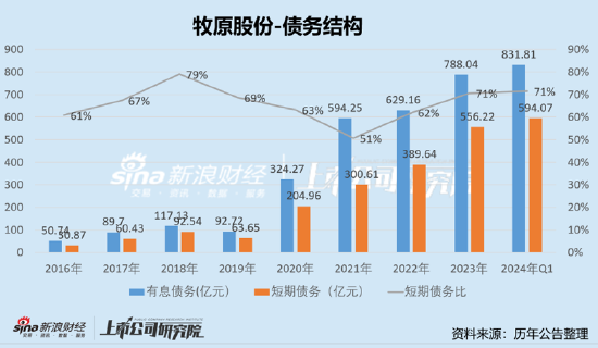 牧原股份激进扩张背后债务资金也在快速膨胀。数据显示,公司2019年有息债务规模(注,公司有息债务主要包括短期借款、一年内到期的非流动负债、其他流动负债、长期借款、应付债券和长期应付款)仅为92.72亿元,而至2024年一季度末,公司的有息债务高达831.81亿元。更需要警惕的是,公司的债务结构主要以短期债务驱动为主。2023年及2024年一季度,公司的短期债务金额分别为556.22亿元、594.07亿元,占比均为71%。