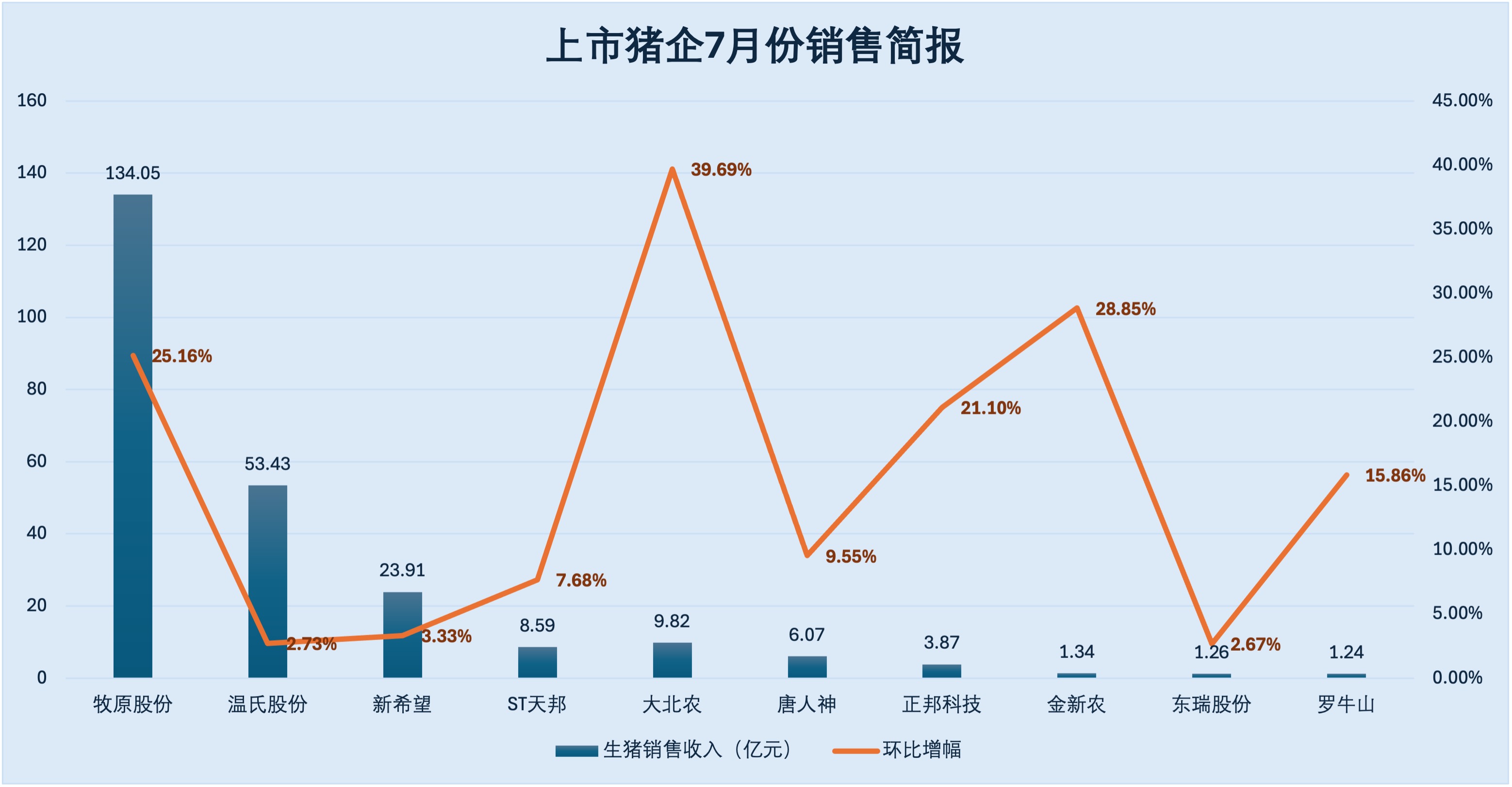 近日,包括牧原股份(002714.SZ)、温氏股份(300498.SZ)、新希望(000876.SZ)在内的十余家上市猪企陆续披露7月份生猪销售简报。受益于猪价持续上扬,三季度的首月,各大猪企销售收入均实现环比增长。