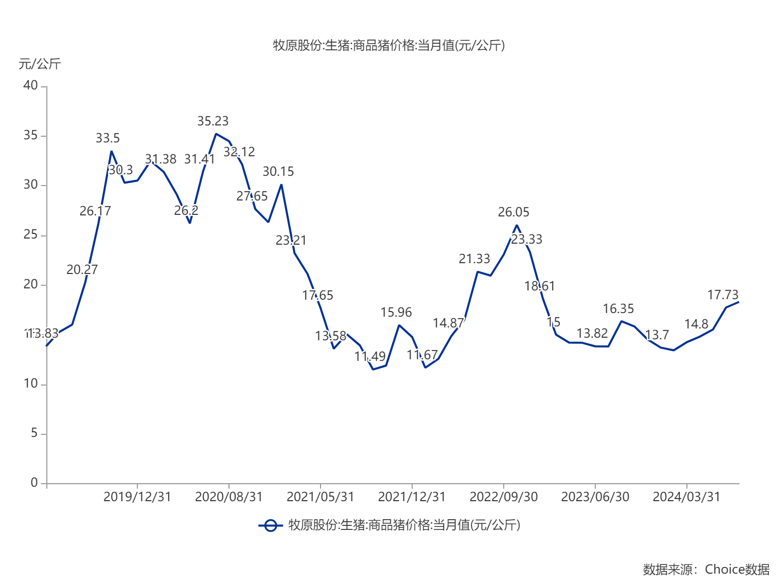 7月份,牧原股份商品猪销售均价18.30元/公斤,相较6月的17.73元/公斤,上升约3个百分点。这是其自2023年1月以来商品猪销售均价首次突破18元/公斤,达到近一年半的最高。