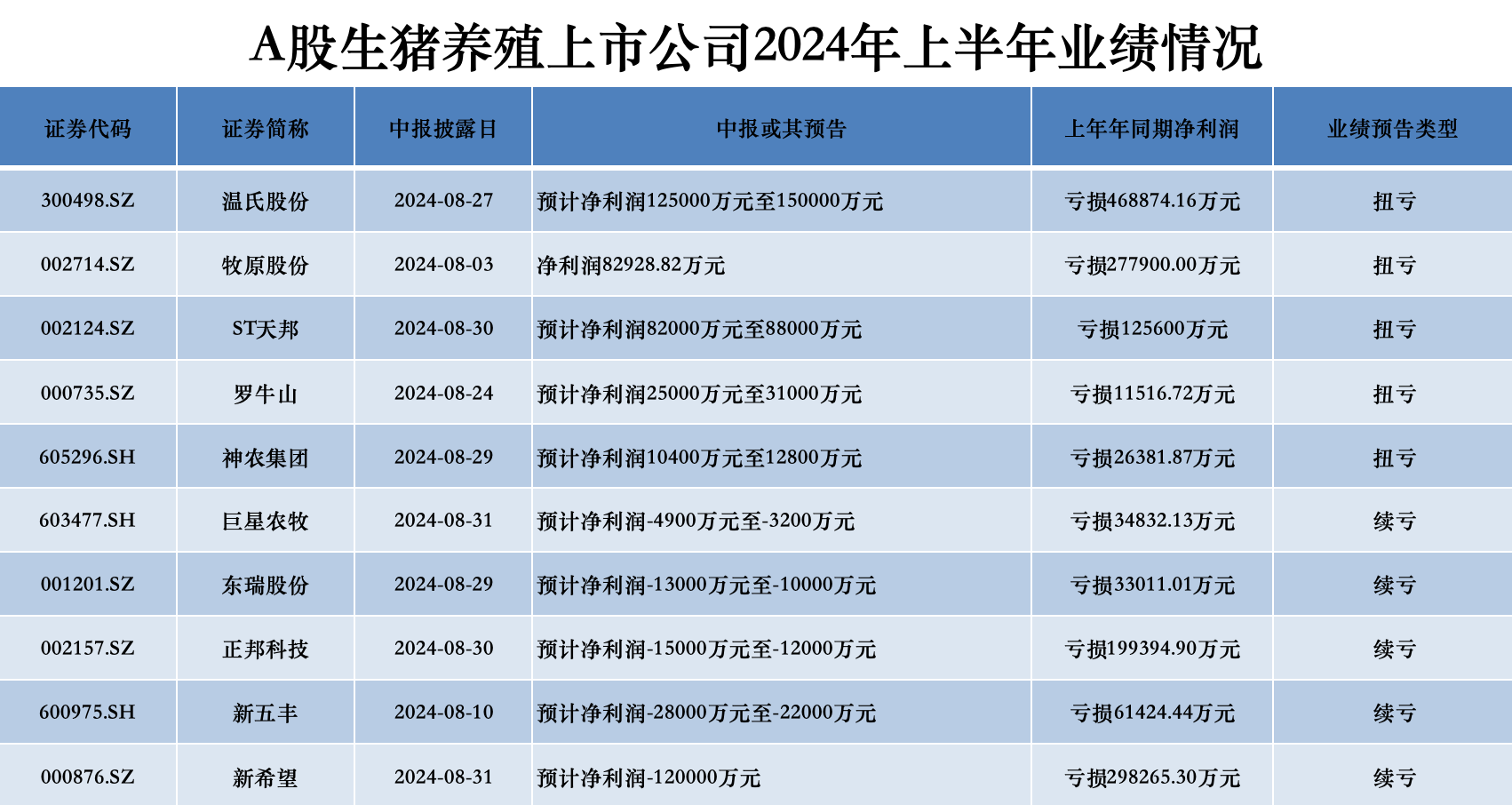根据已披露的半年报或其预告,2024年上半年,10家申万生猪养殖行业上市公司(来自Choice数据)中,5家公司净利润扭亏为盈,5家续亏但也都实现同比减亏。牧原股份、温氏股份等头部猪企带头吹响盈利的号角。