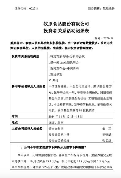 牧原股份向投资者介绍了今年以来的成本下降拆分及成本下降的展望。今年以来,公司加强健康管理,各项生产指标逐步提升,生猪养殖完全成本持续下降,10月已降至13.3元/kg,相比年初的15.8元/kg下降2.5元/k g,其中饲料价格下降贡献50%左右,生产成绩改善和期间费用摊销下降贡献50%左右。