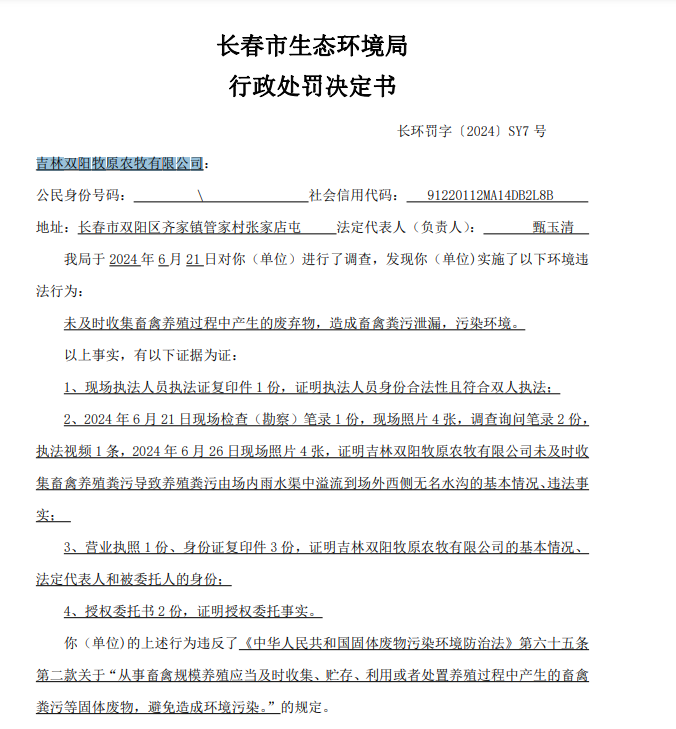 今年7月24日,牧原股份子公司吉林双阳牧原农牧有限公司因“未及时收集畜禽养殖过程中产生的废弃物,造成畜禽粪污泄漏,污染环境。”的行为违反了环保法律法规,被长春市生态环境局处以4万元罚款。