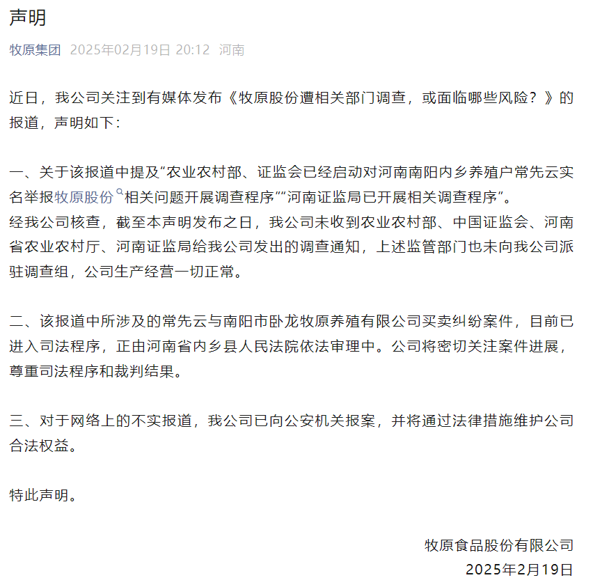 2月19日晚间,牧原股份通过其微信公众号发布声明回应此事。声明称,截至声明发布之日,公司未收到农业农村部、中国证监会、河南省农业农村厅、河南证监局发出的任何调查通知,上述监管部门也未向公司派驻调查组。牧原股份强调,公司生产经营一切正常。