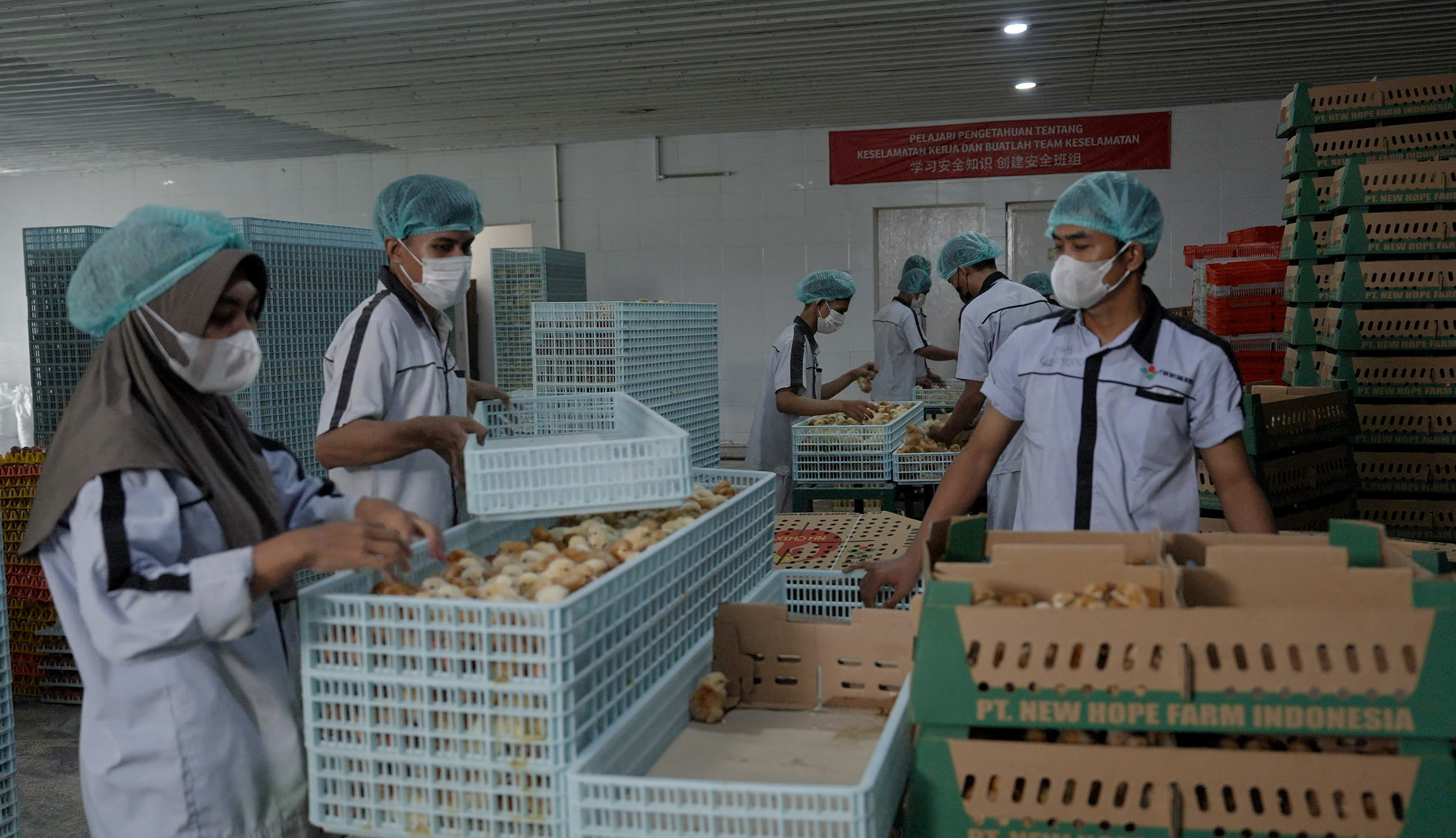 新希望印尼种禽场的工人正在检查即将发给养殖户的鸡苗新希望供图