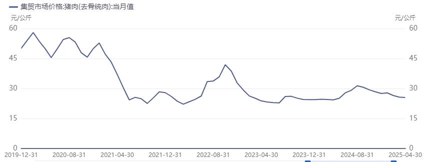 据数据,2019年末猪肉价格为50.09元/公斤,2020年受市场供需变化、非洲猪瘟等因素的影响,猪肉价格开始走低,至2021年末猪肉价格已跌至27.94元/公斤;2022年猪肉价格略有回升,但2023年猪肉价格再度下跌,并跌至24.32元/公斤。
