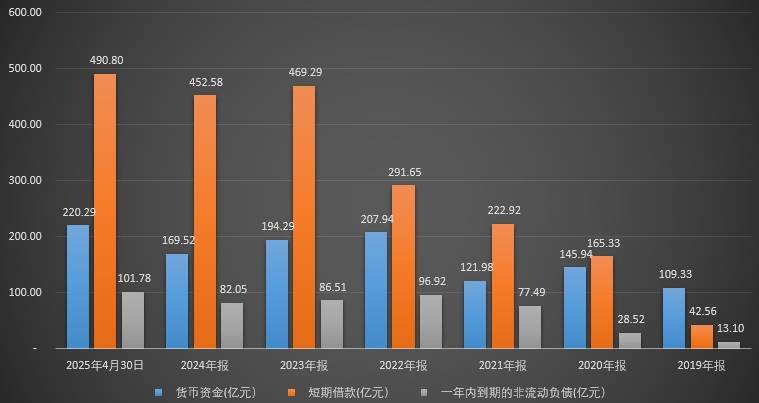 与此同时,牧原股份的货币资金并未出现同等幅度的增长。2019年时,牧原股份账面货币资金余额109.33亿,至2024年末时牧原股份账面的货币资金余额为169.52亿。截至今年4月30日,牧原股份的账面货币资金余额为220.29亿,不足同期短期有息债务的4成。