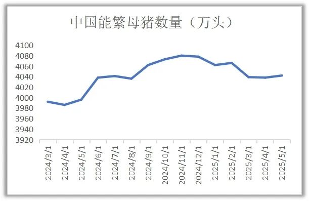 农业部数据显示,2024年4月我国能繁母猪存栏停止去化,从3月底3992万头增至年底4078万头,今年5月仍有4042万头,处历史高位。按母猪妊娠到出栏需十个月算,至少明年一季度前供给端不会变。